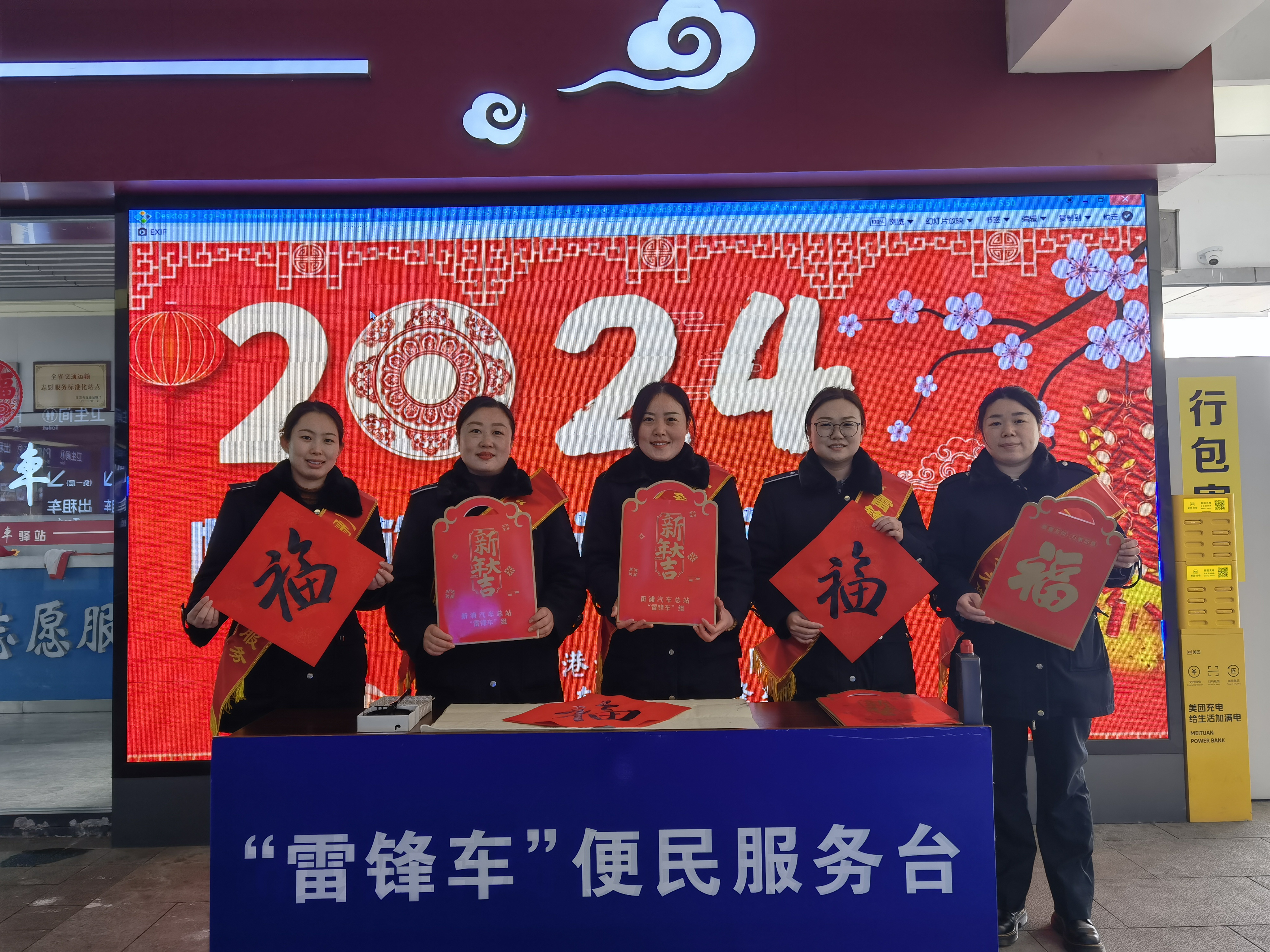 新浦汽车总站候车厅和驿站悬挂着红色灯笼和拉花,营造了浓厚节日氛围,让人感受到浓浓的年味,更让旅客感受到家的温暖。上午九点,总站候车厅、驿站门前的“雷锋车”组志愿服务台上摆满了对联和“福”字,“雷锋车”们向旅客分发对联和“福”字,为他们送上了新春的祝福。接过对联和“福”字的旅客纷纷表示感谢,也把新春祝语送给了“雷锋车”们。