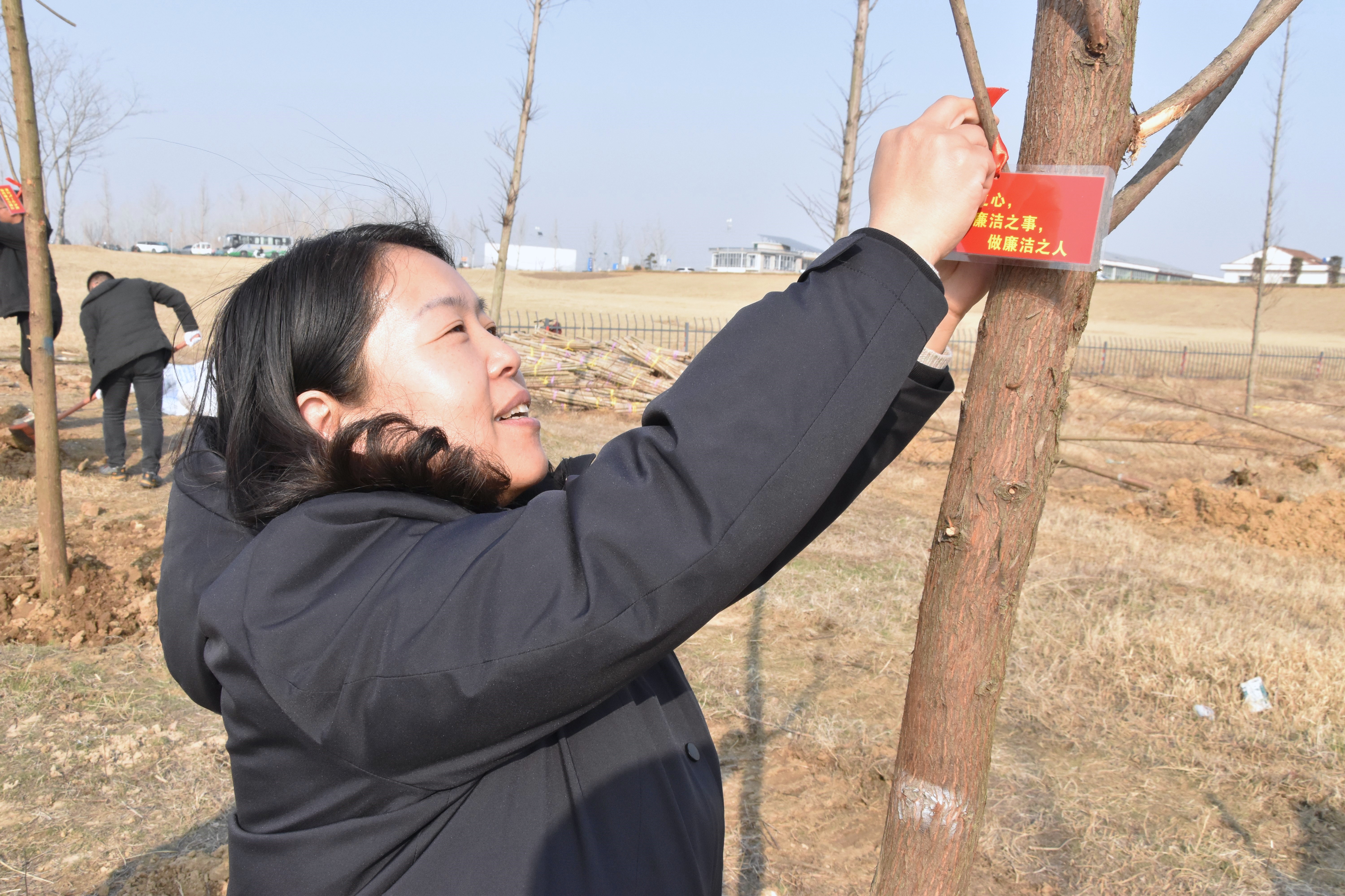 活动中,大家挥锹铲土、培土围堰、提桶浇水,分工明确,经过辛苦劳作,一棵棵小树苗在和煦的春风中昂然挺立,孕育着勃勃生机,焕发出绿色希望。党员干部还在各自手植的“廉洁树”枝头,挂上“廉洁标语牌”,时刻警醒自己,要知敬畏、存戒惧、守底线,让清廉文化渗透到日常生活的各个方面,让清廉之风吹遍每个角落。