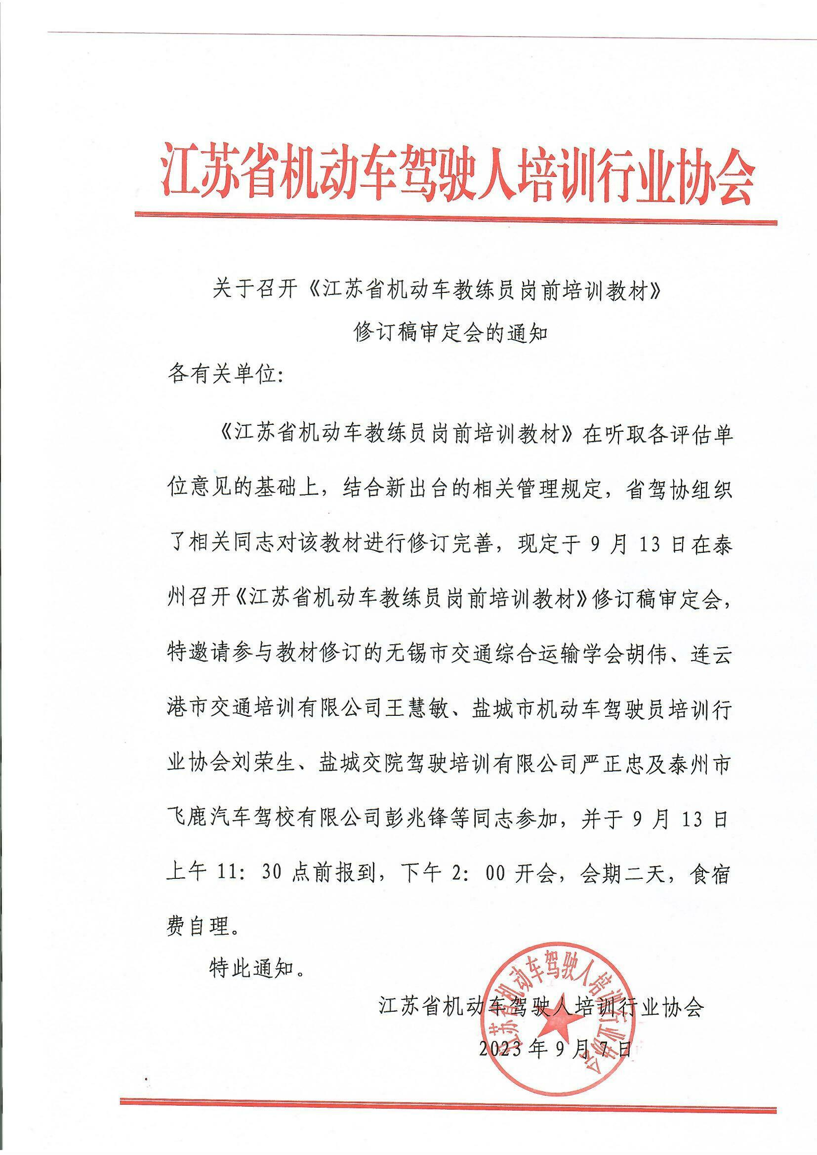 9月13日,《江苏省机动车教练员岗前培训教材》修订稿审定会在江苏泰州召开。交培公司驾培事业部王慧敏同志作为江苏省驾驶人行业协会专家组成员,受邀参加《江苏省机动车教练员岗前培训教材》修订稿审定工作。