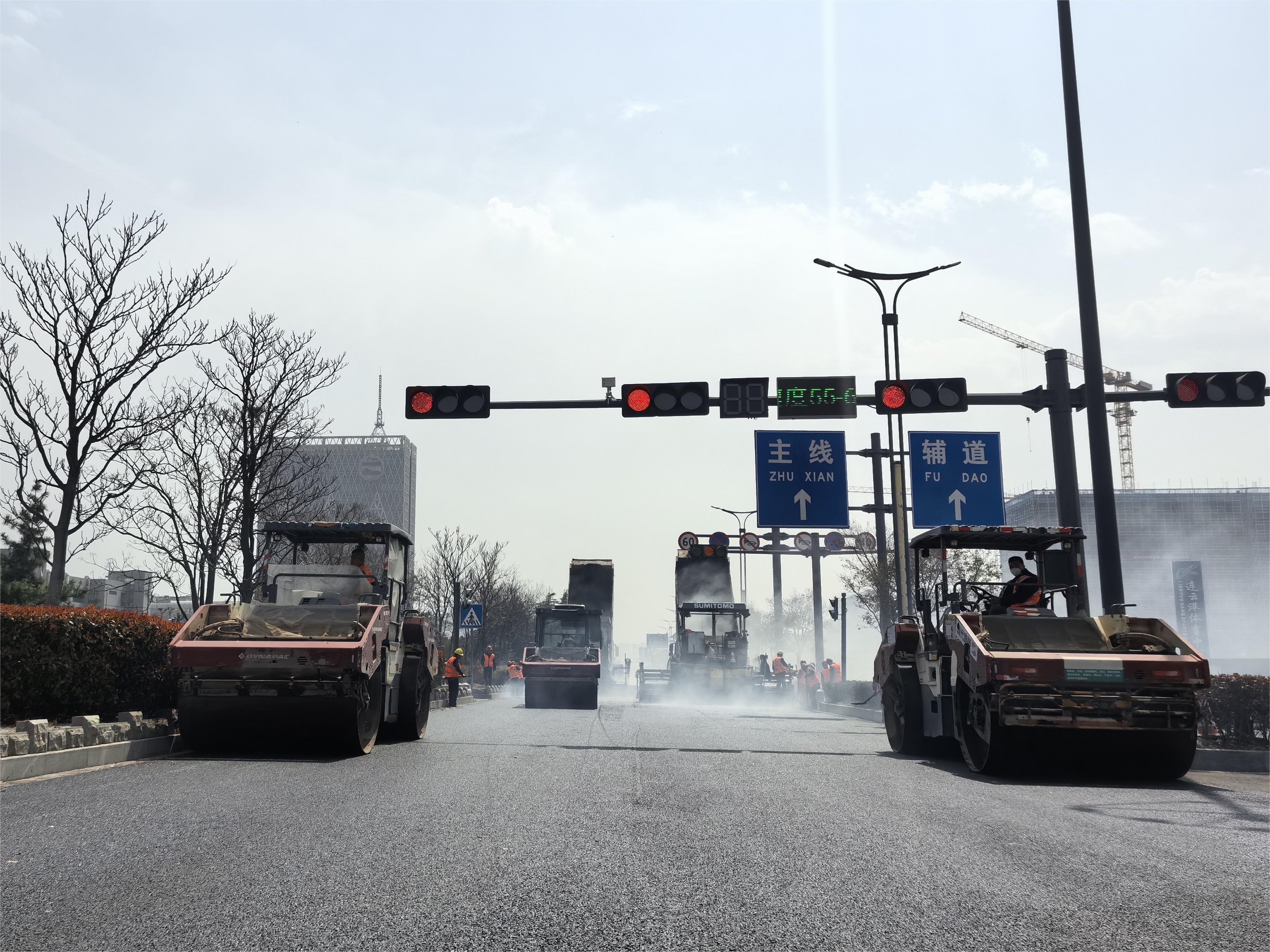 花果山大道与310国道(港城大道)交叉口改造工程进行沥青摊铺