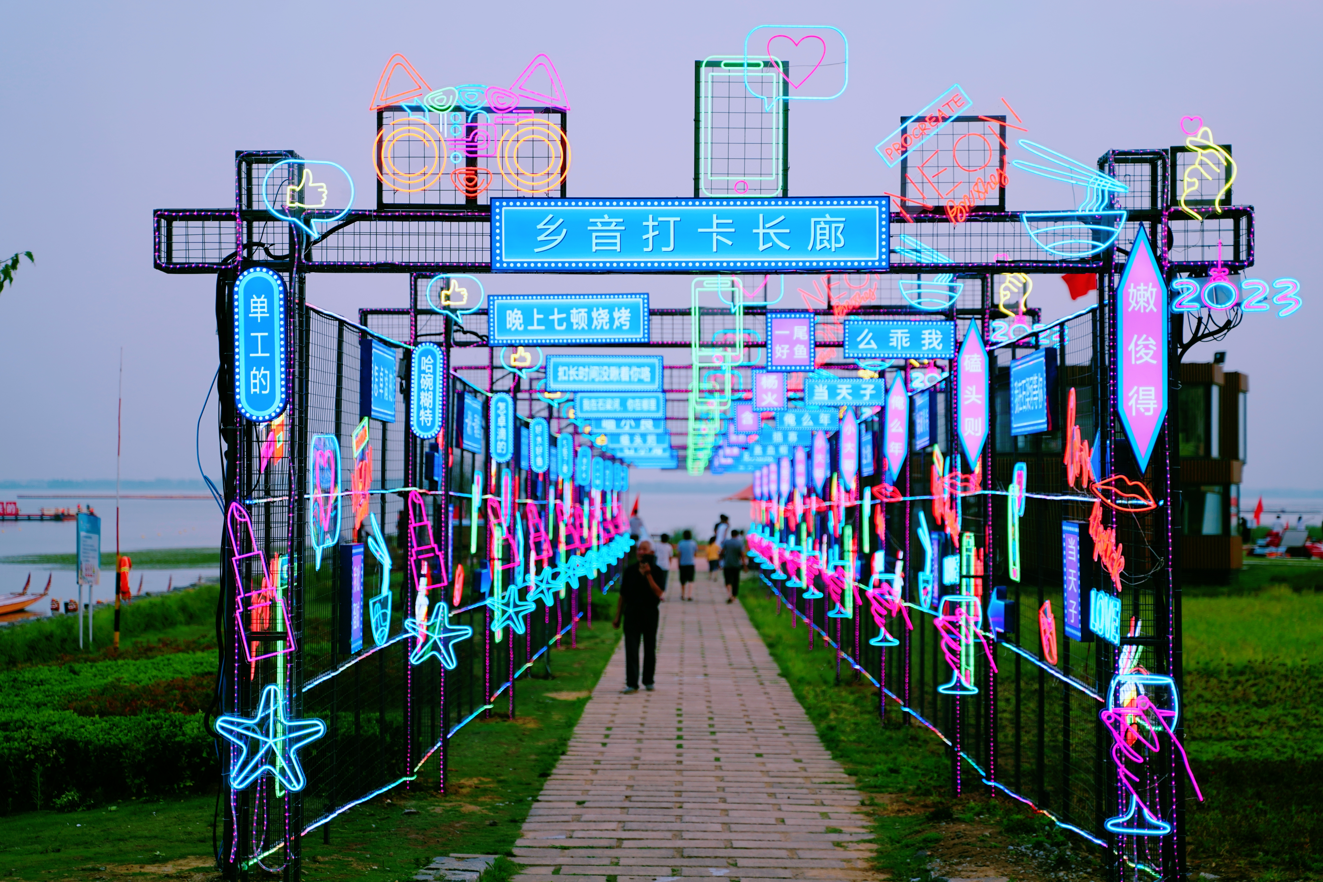 即将于端午节举办“海陵湖第二届文化旅游节”龙舟赛的渔人码头,鱼主题花灯步道、连云港方言主题花灯潮玩长廊、鱼篓灯光打卡点等多处灯光景观错落有致亮相,用绚烂光影将水文化、渔文化、生态文化、地方文化、夜游文化充分结合,再现“一夜鱼龙舞”盛况;码头主观光区设置露营帐篷区,为游客提供生态湖景露营体验,让游客尽享三年生态修复的绿色福利;在生态停车区和彩绘步道周边设置后备箱市集、水畔市集和帐篷市集,海陵湖的微风吹来,浓浓的烟火气和十足的时尚范融合在熙来攘往间;在水上,高规格龙舟赛道鲜艳整齐排列,国际标准赛用龙舟就位,我市“最美”赛道即将于22日迎来20个参赛队伍的“速度与激情”。