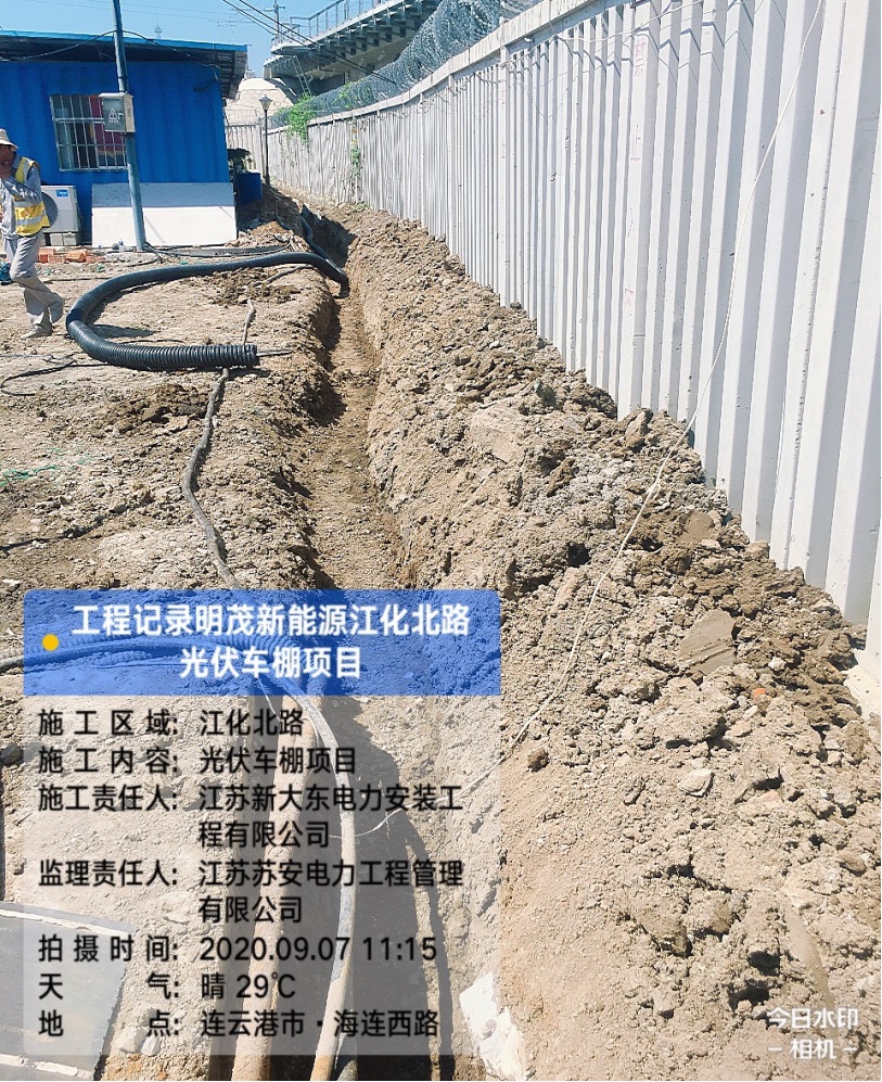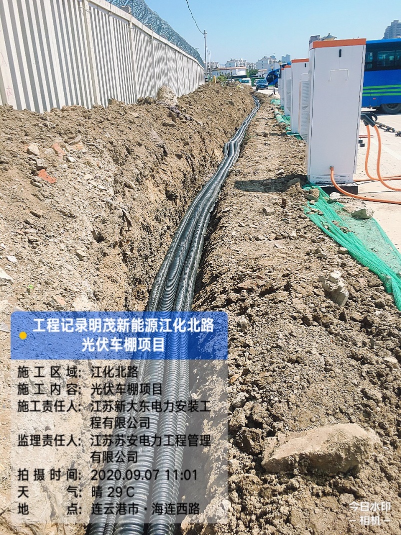 目前,江化北路光伏车棚项目已完成基础施工正在进行电缆铺设、车棚地基建设工作。本次施工共计建设4台120KW直流充电桩和一座光伏车棚。