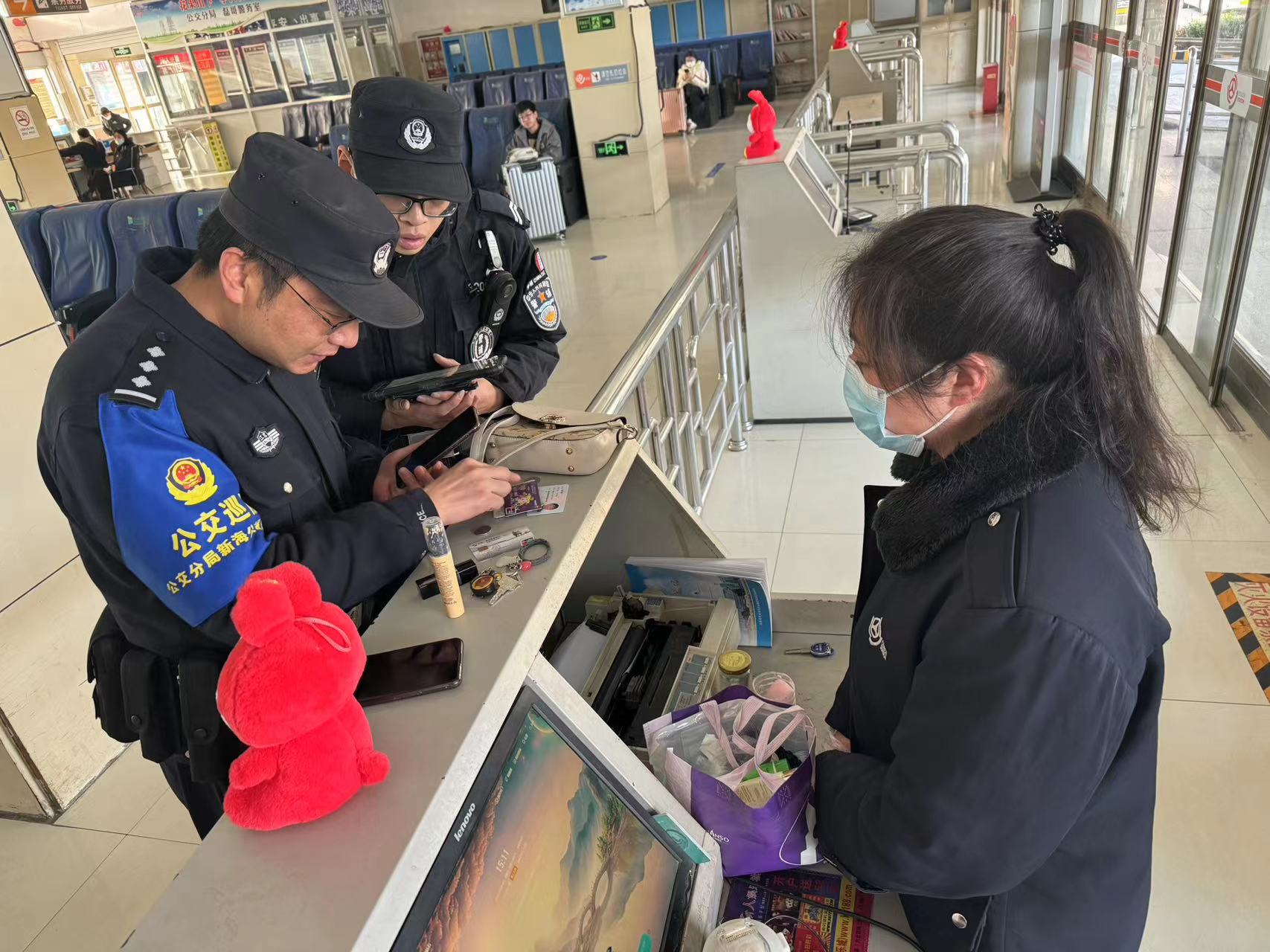 12月14日,站务员李宁在检票口附近发现了一个米黄色皮质肩包掉落在角落无人问津,“这是哪位旅客的背包?”问了几遍,大厅内的旅客都摇头说不是自己的!于是,李宁马上通知广播室播报失物招领,并将背包交到车站服务中心进行遗失物品登记。报警后,李宁同公交派出所民警一起检查包内物品,通过包里证件,警察找到了张女士。