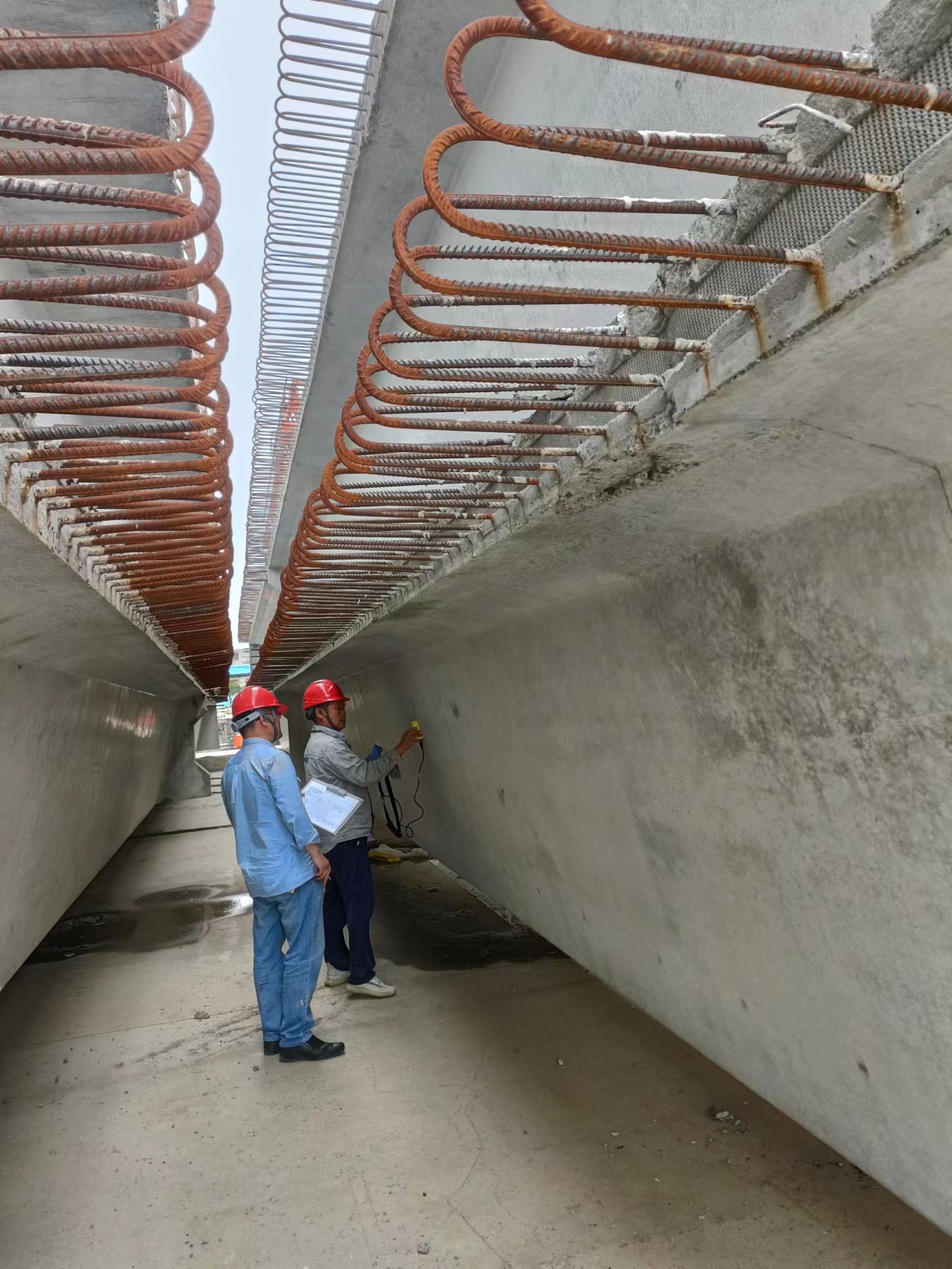 本次检查主要对海州区洪东线X353、浦新线X205(204-魏口)、海中线X252、浦平线二总桥、板新线磕头桥改建工程中的磕头桥已达28天龄期的箱梁进行抽检。检查内容包括外观、强度、钢筋保护层厚度等各指标。检查小组还抽取了钢筋、水泥、黄砂、石子等原材料带回新丝路检测公司做样品检测,新丝路公司将及时出具《检测报告》,为项目的质量管控提供详实依据。
