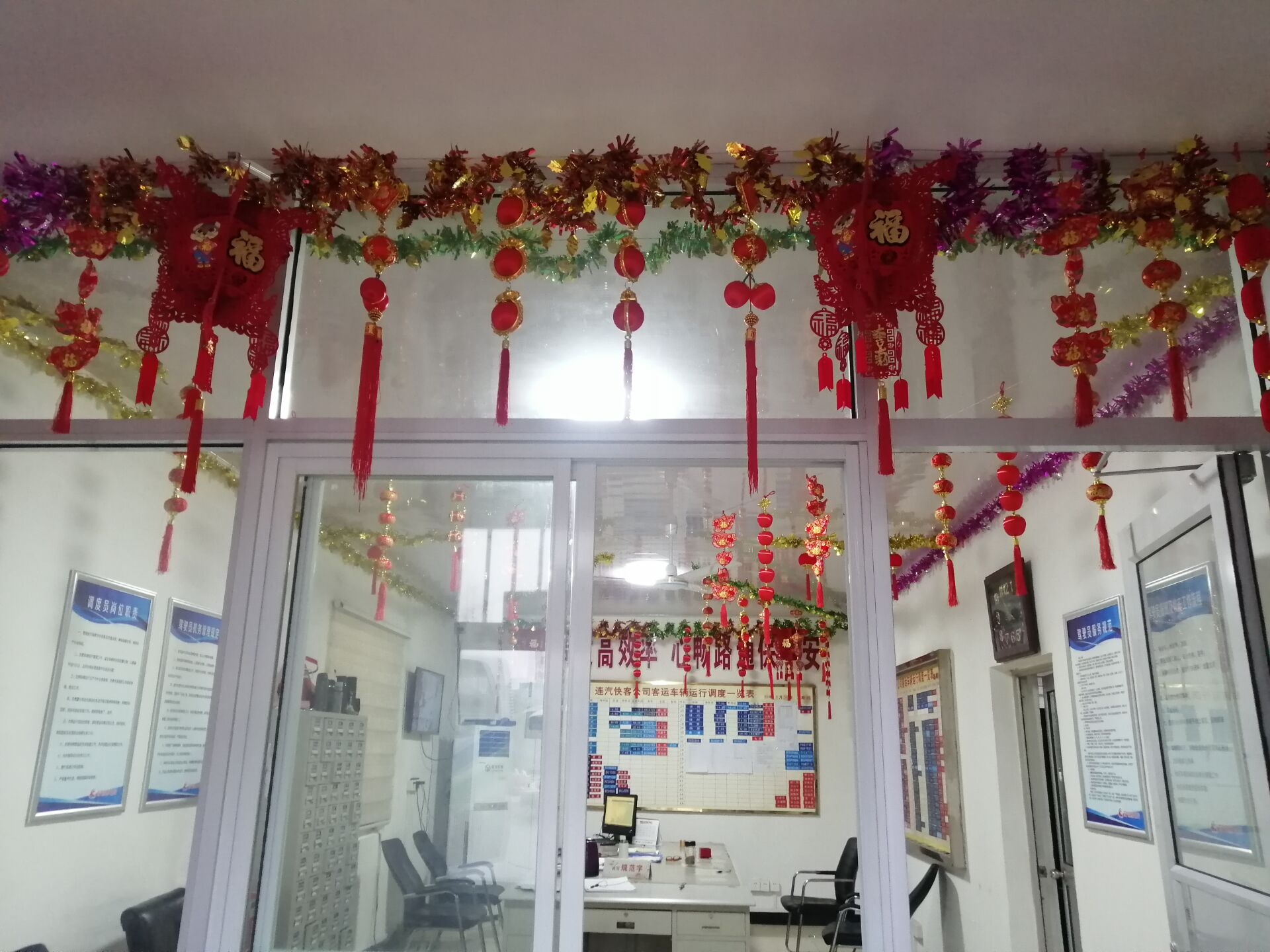春节将至,为营造深厚的新春氛围,以崭新的面貌喜迎新的一年,快客公司于1月22日上午在运调中心及驾驶员休息室大门两侧挂起了国旗,火红的大灯笼也高高挂起。在运调中心办公区域悬挂起一个个火红的小灯笼和“福”字,在办公楼区域贴起了“喜迎八方来客平安一路、满载五湖春意幸福一生”,横批“贺新禧”的对联,积极营造温馨祥和“家”的氛围,让整个运调中心和办公区域年味十足,通过这些喜庆的形式来迎接新春的到来。