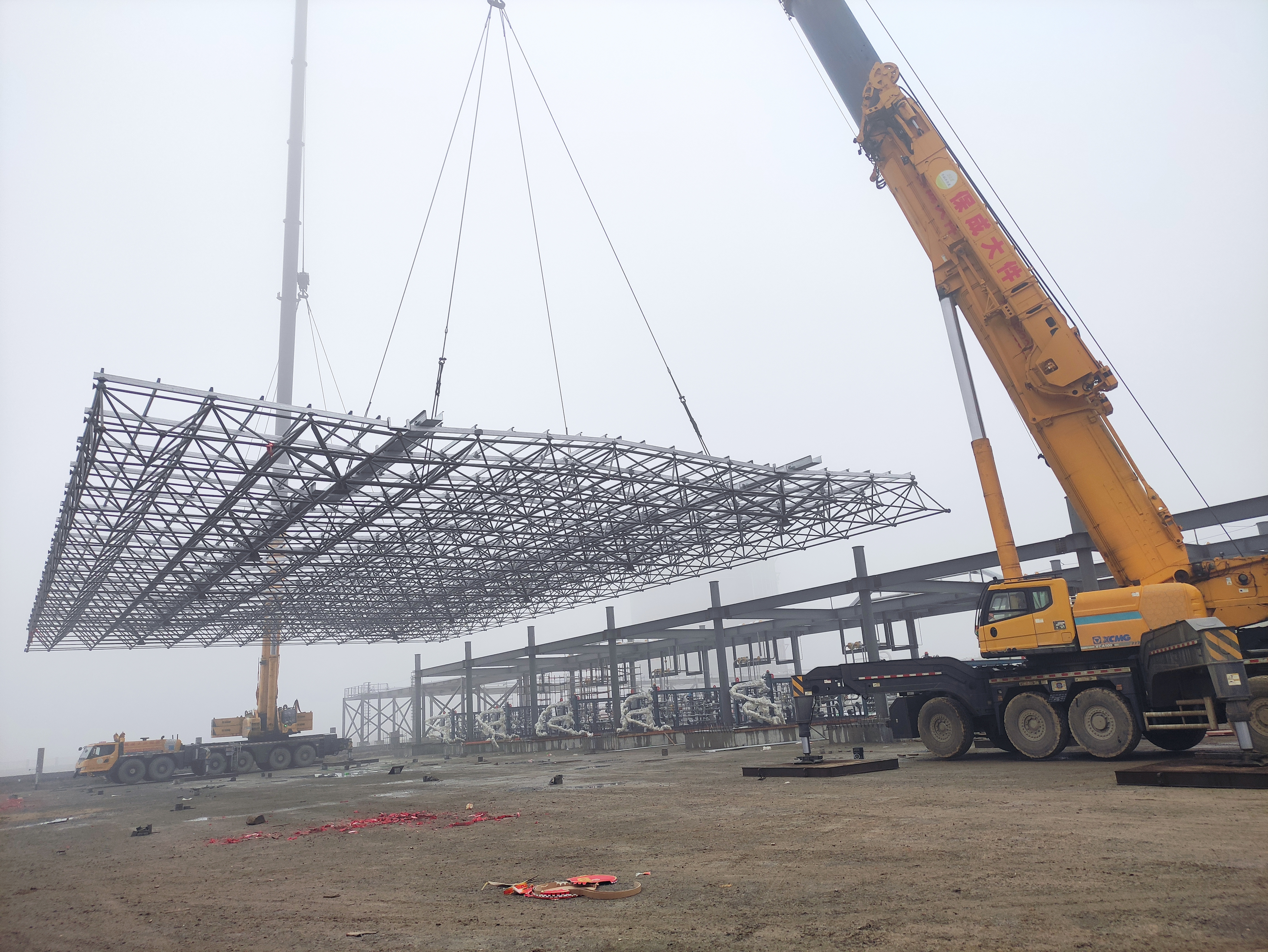12月30日,物流九州app最新版下载,九州(中国)LNG储配站槽车装卸区钢结构网架精准落位,槽车装卸区钢结构吊装顺利完成,标志着影响工期关键节点的钢结构施工实现突破。