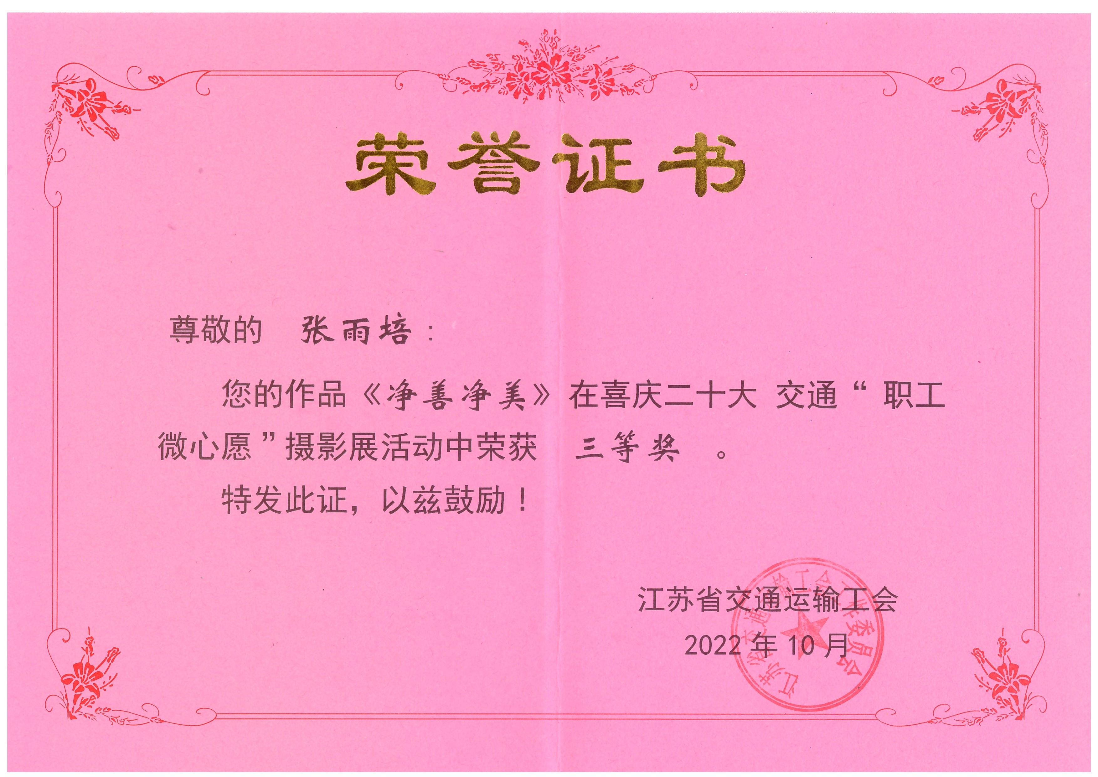 近日,从江苏省交通运输工会传来喜讯,连云港市公交九州app最新版下载,九州(中国)职工张雨培的摄影作品《净善净美》在喜庆二十大交通“职工微心愿”摄影展活动中荣获“三等奖”。