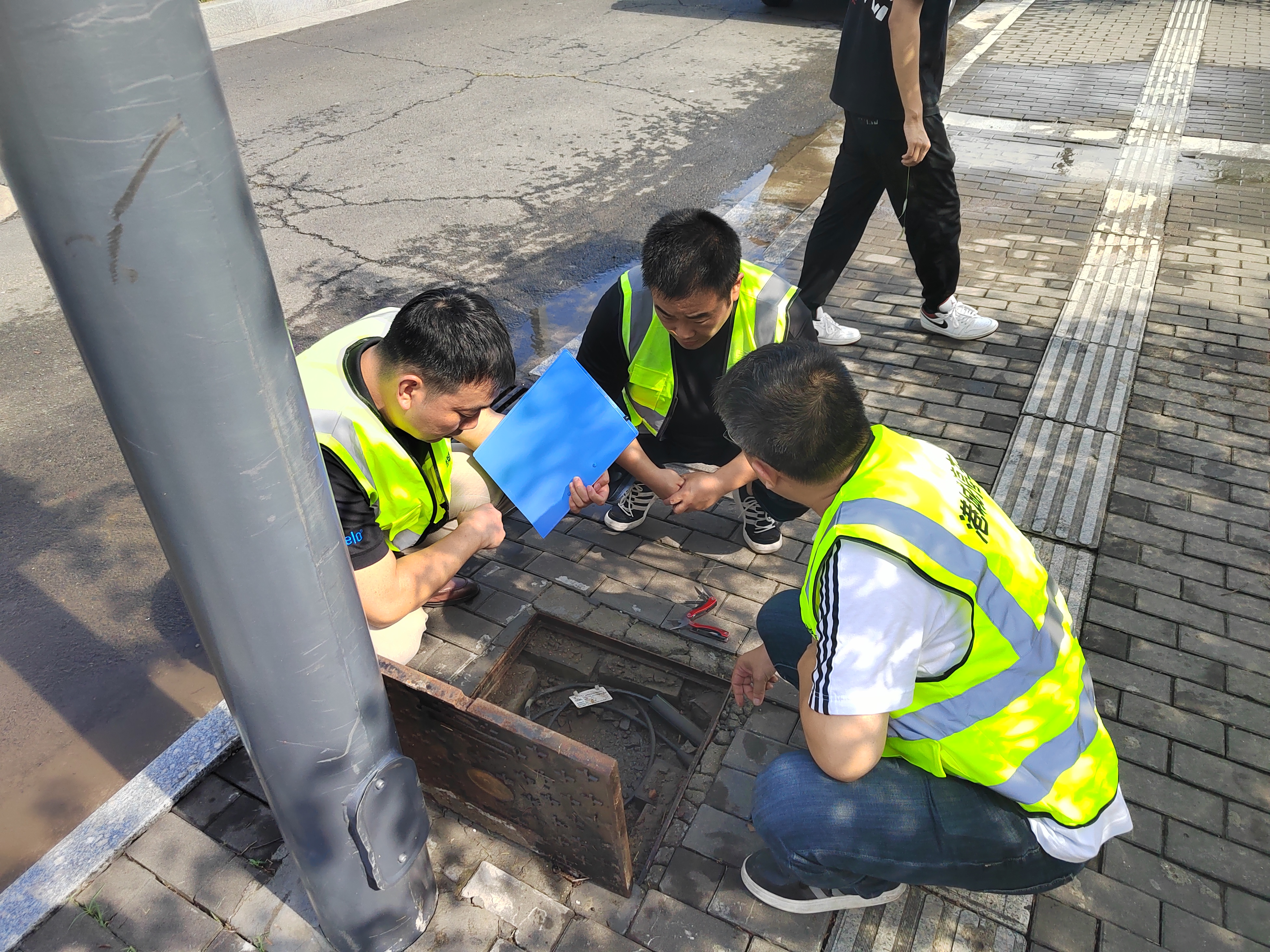 当日出现强对流天气,狂风呼啸,暴雨侵袭,雨停后气温急速飙升。巡检排查小组顶着烈日对21条高位视频路段展开“拉网式”排查,重点对智能化设备运行情况及安全隐患进行重点检查。他们通过对讲机时而与领导沟通,时而呼叫技术员进行相应操作,巡检工作紧张而有序。虽然汗水浸湿了衣衫,衣服贴在身上难受极了,可他们全然不顾,在烈日下穿梭在一根根杆件之前,不放过一处细节,不遗漏一个隐患。现场检查中,安全员姜波突然发现一个维修井内有上少量积水,为防止积水对设备线路造成影响,他第一时间清理出积水,并立即联系施工方,针对产生积水原因进行了现场整改。截至目前,巡检排查小组一共检查杆件347,检查出维修井积水3处,所有杆件均运行正常,所有隐患问题均已整改,有效保障了智慧停车高位视频设备的正常运行。